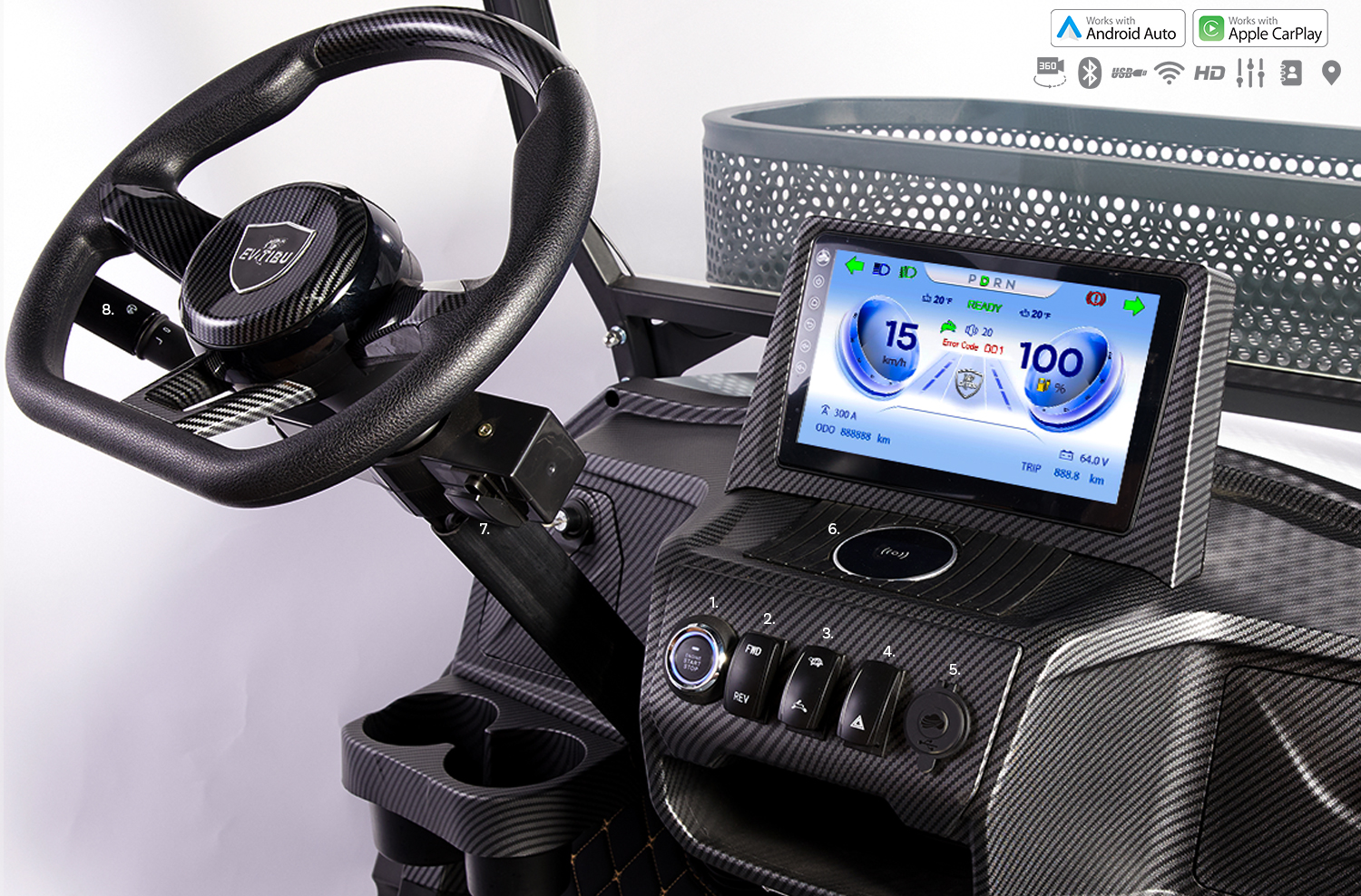 - New 10.1” HD Touchscreen: with wireless Apple CarPlay and Android Auto, paired with the innovative EV TIBU AllSeeingCam 360 system, offering a panoramic view for a safer drive.
